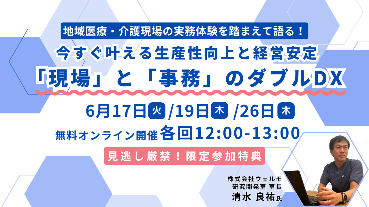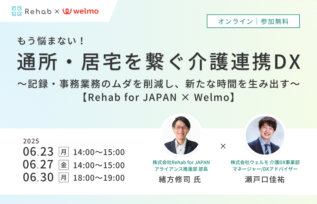 【無料ウェビナー開催】もう悩まない!通所・居宅を繋ぐ介護連携DX ~記録・事務業務のムダを削減し、新たな時間を生み出す~【Rehab for JAPAN × Welmo】